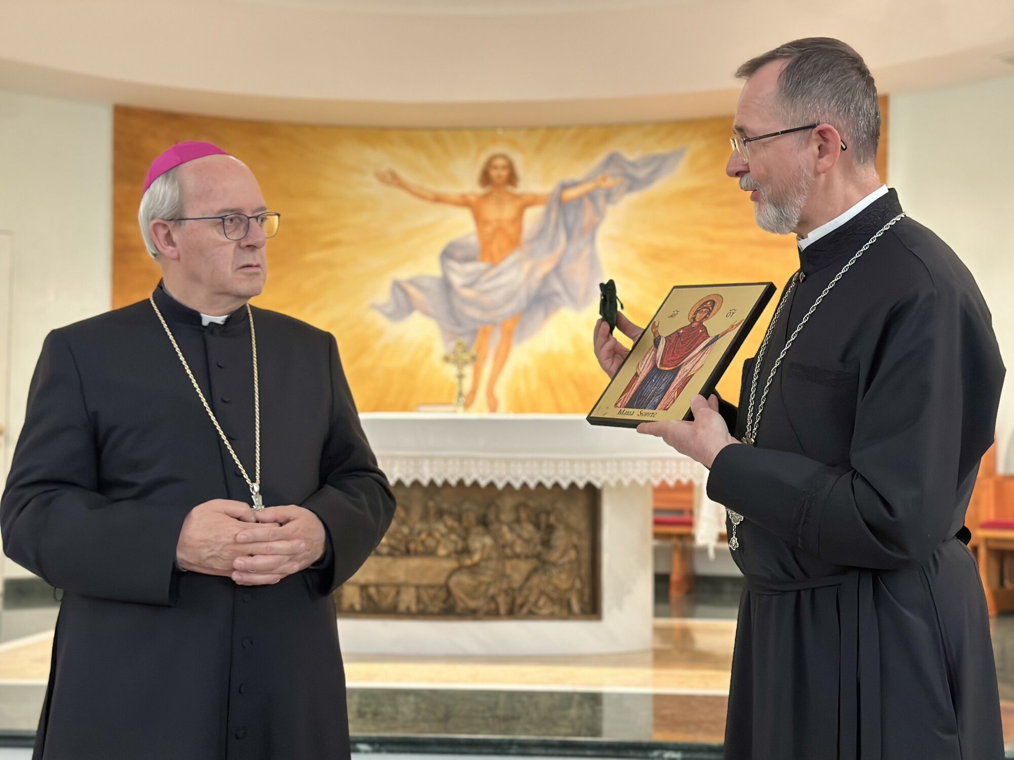 Владика Богдан щиро подякував архиєпископу Москоне за братерську підтримку та солідарність із українським народом і вручив йому пам’ятні подарунки як знак вдячності від Апостольського екзархату.